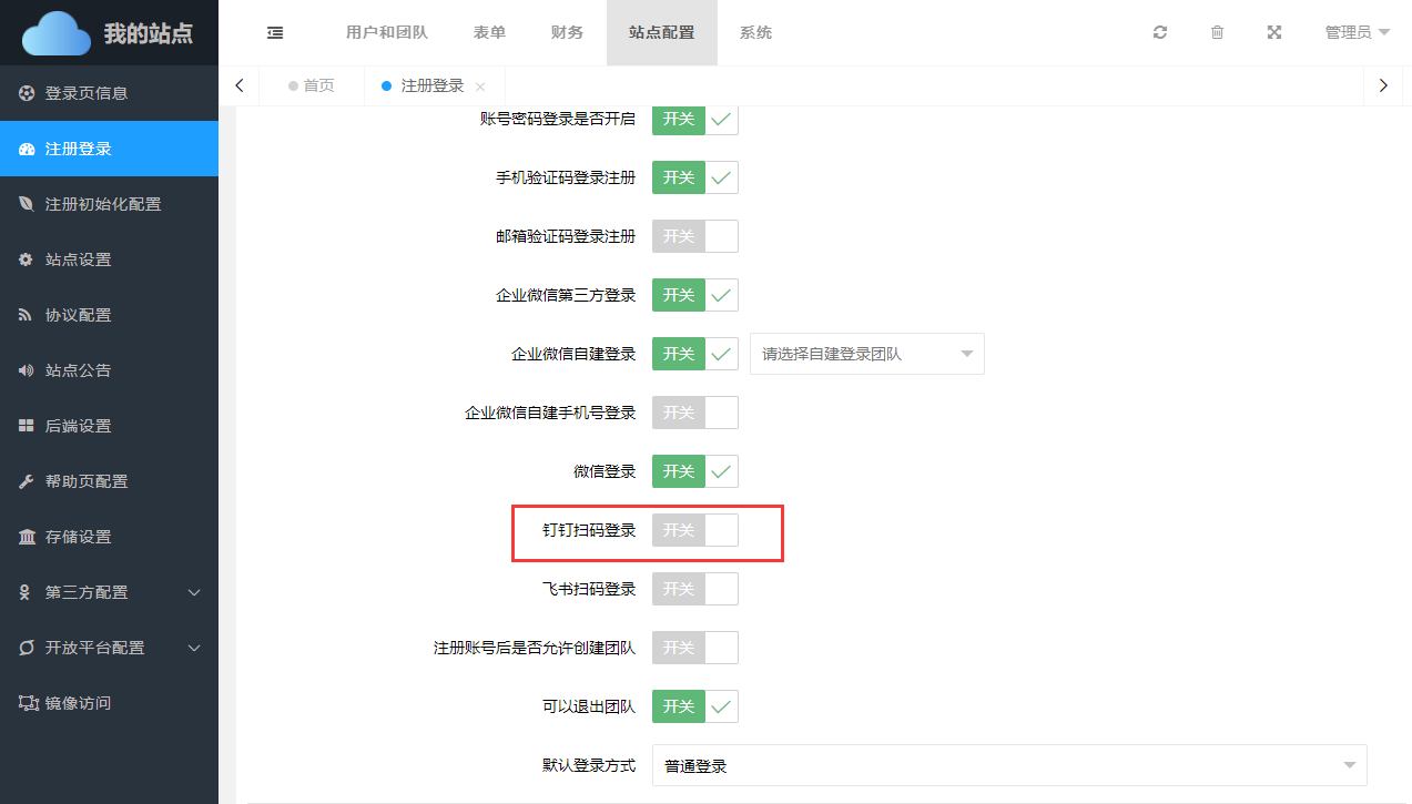 在后台【站点配置】->【注册登录】选项中,开启钉钉扫码登录开关,否则无法进行钉钉扫码。