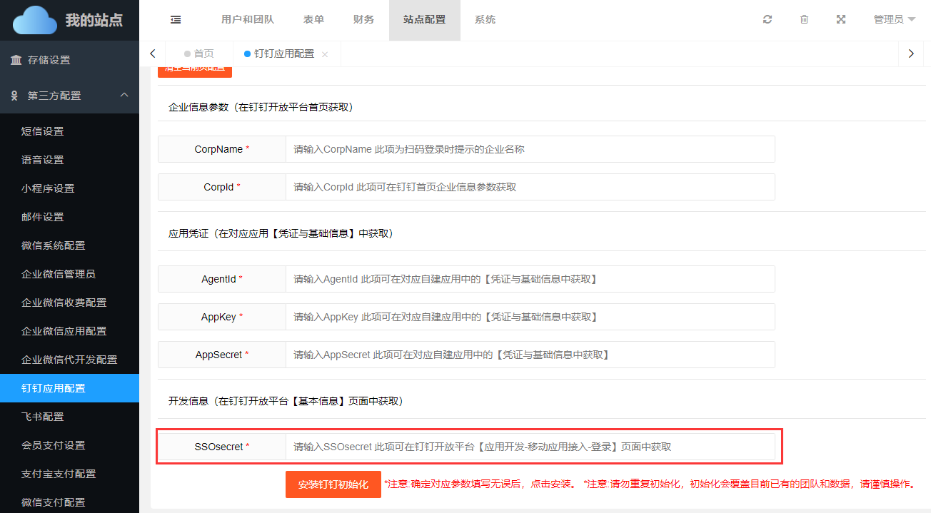 如需对接钉钉办公,还需要在【站点配置】->【第三方配置】->【钉钉应用配置】中正确填写绑定参数。