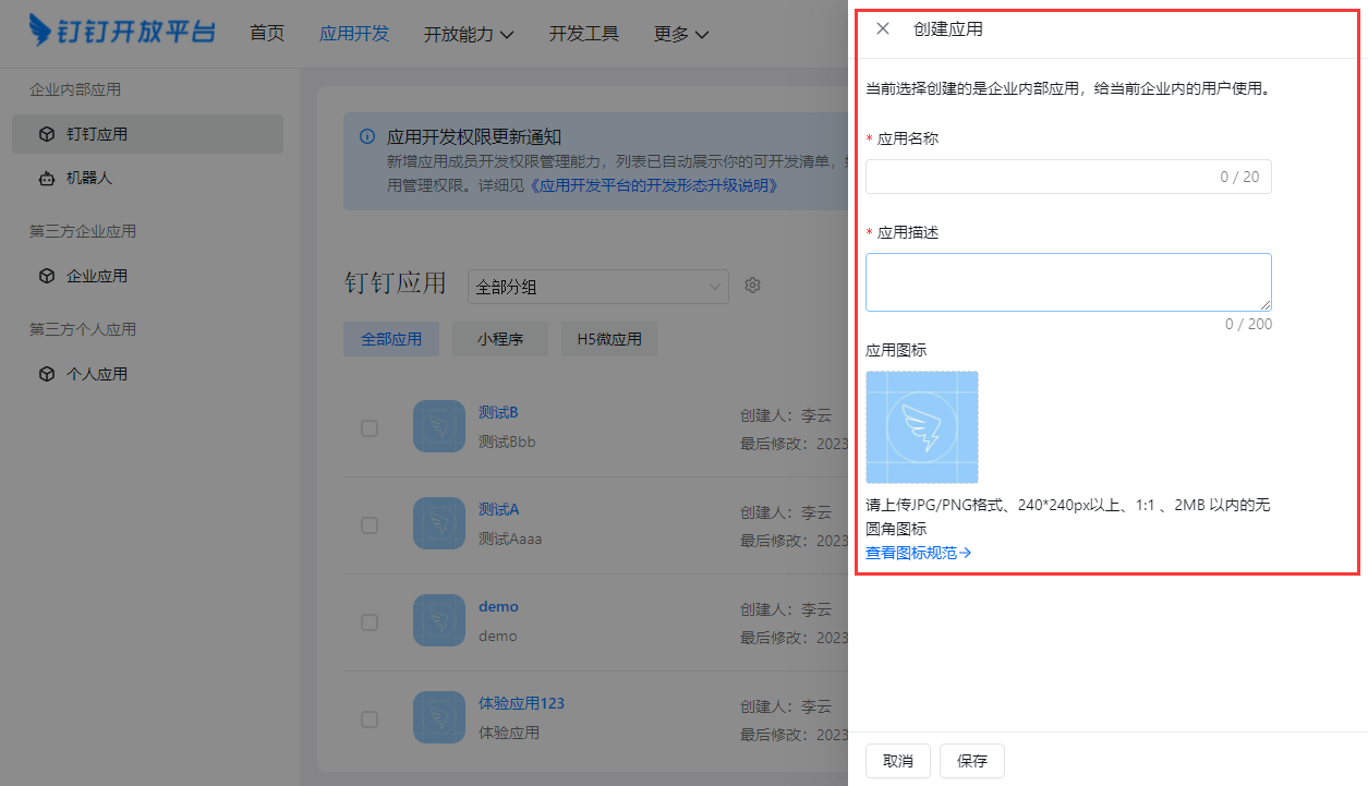 访问(https://open-dev.dingtalk.com/v2/fe/app#/corp/app)