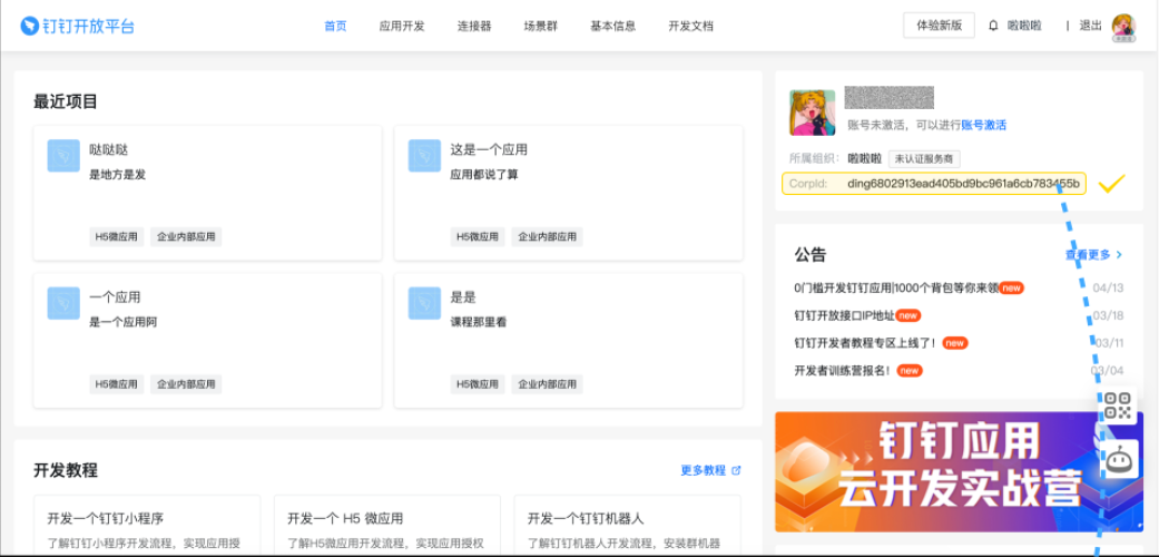 第一步需要先扫码登录钉钉开放平台