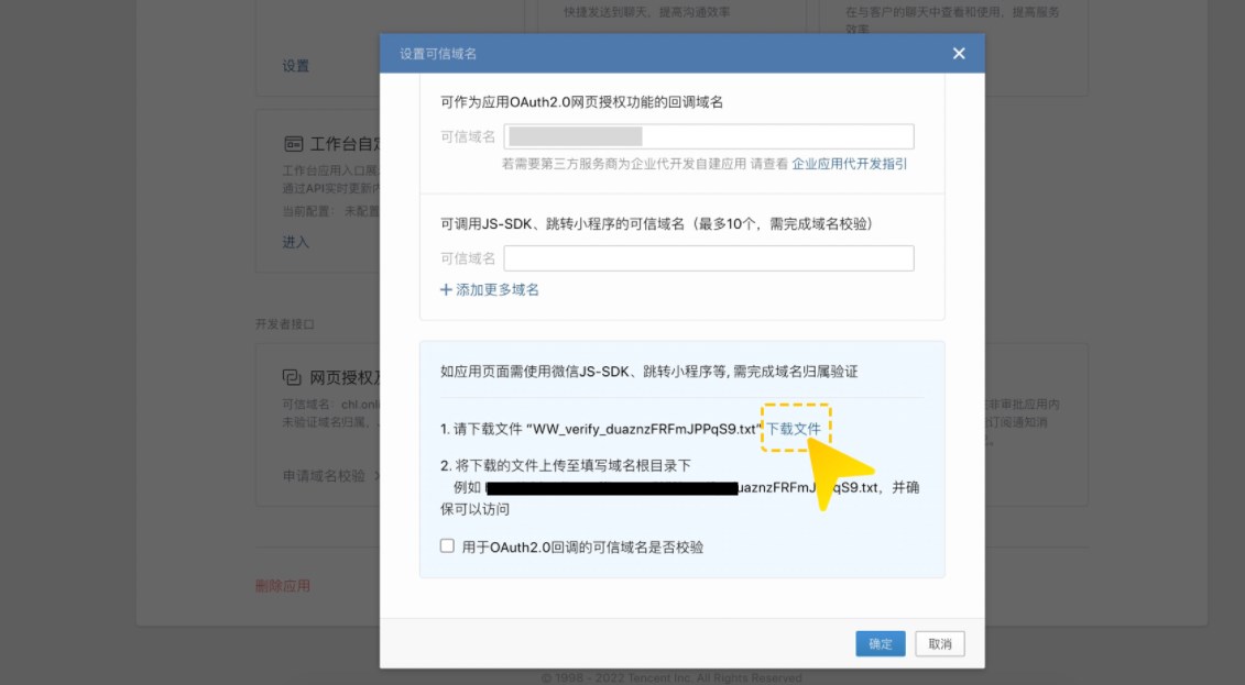 1、在 企业微信自建应用授权 点击JS-SDK可信域名域名参数进行复制