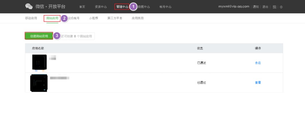 在绑定公众号之后,需创建网站应用后进行后续操作;