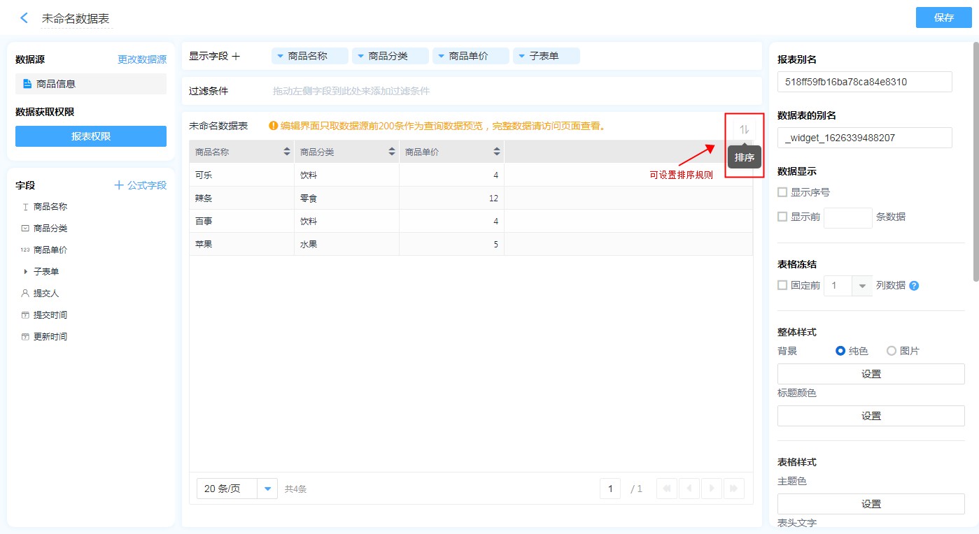 (2)点击 【图表数据展示区】字段列表头快捷地给对应字段设置排序。