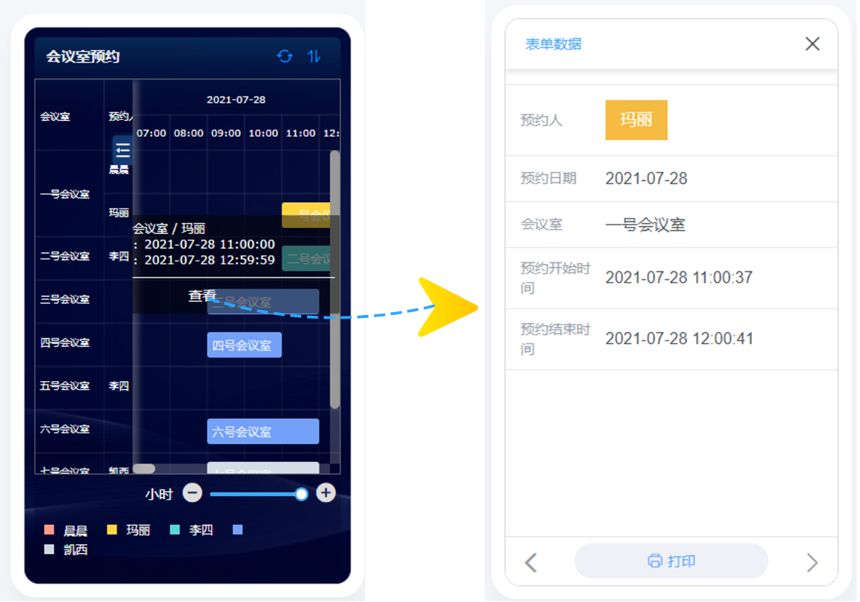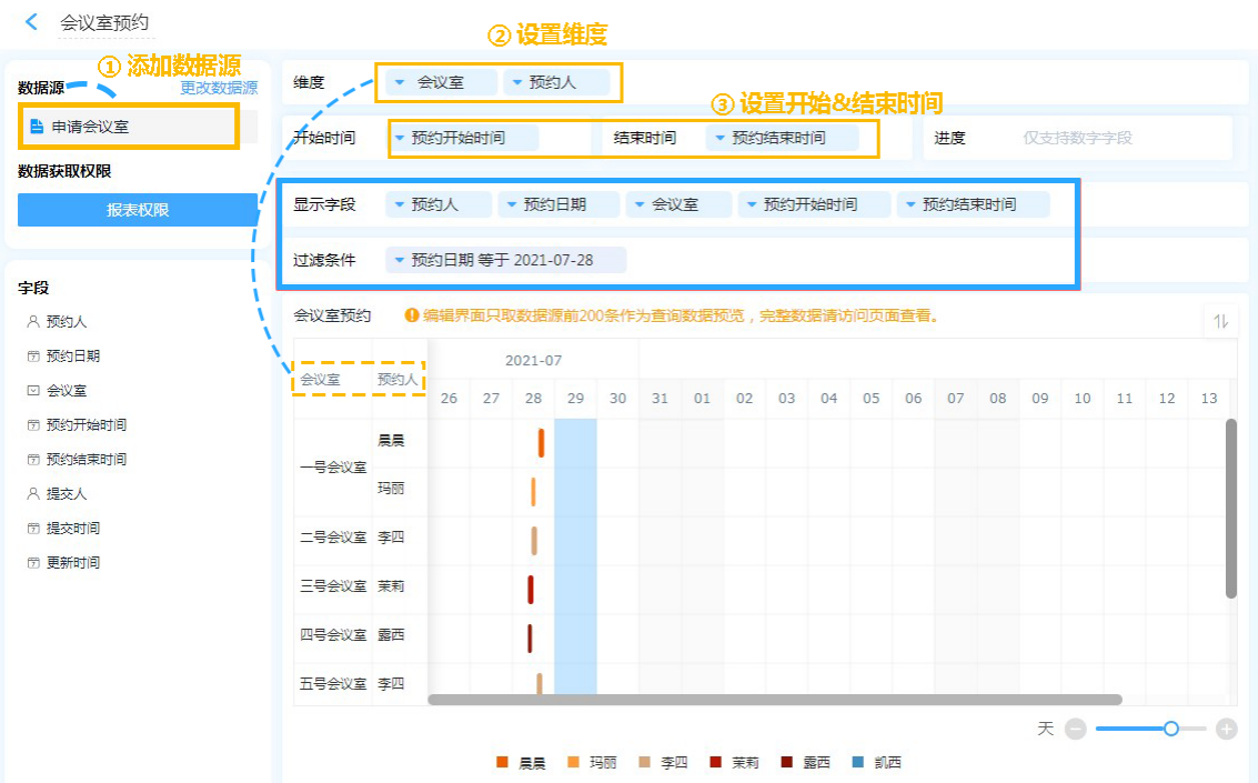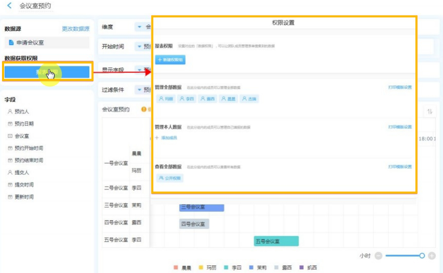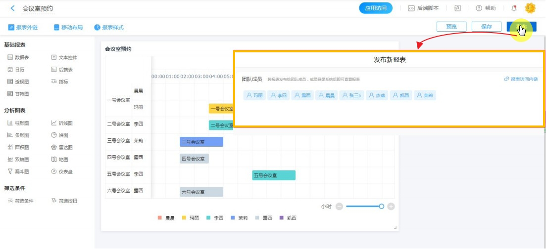 设计如图所示的会议室预约表单,发布给成员填报表单来进行会议室预约。