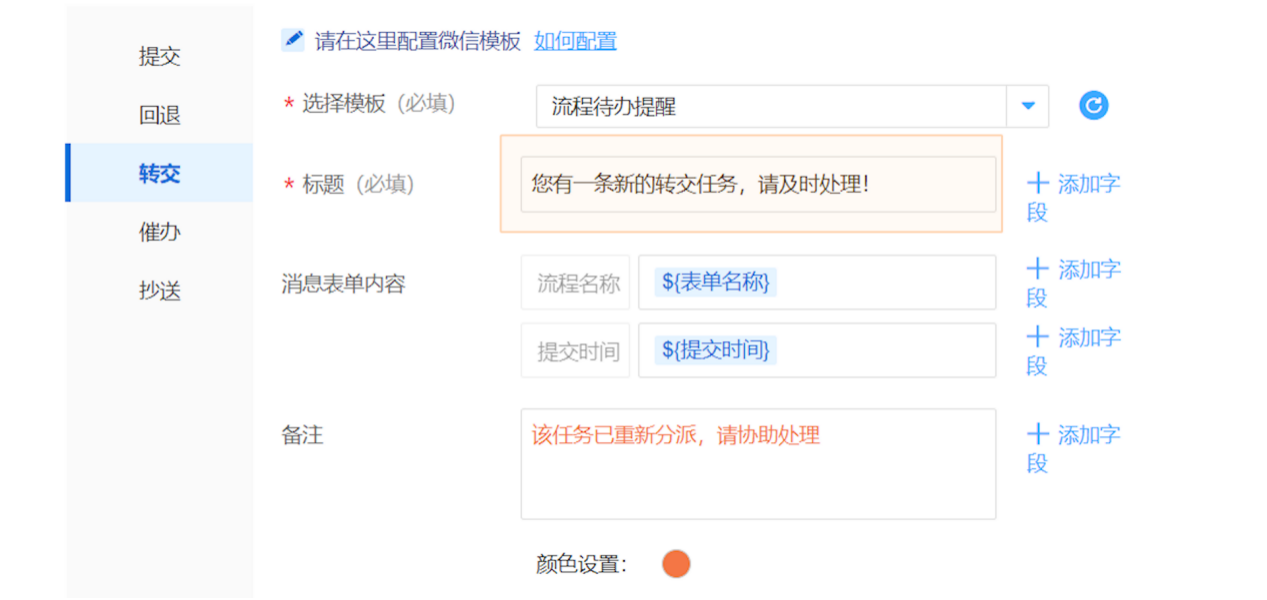 | 支持将需要的内容直接通过微信推送给对应的接收人,团队以微信作为日常工作流渠道时,可以选择使用“微信提醒”相关成员处理日常业务或工作流程中待办的事务。