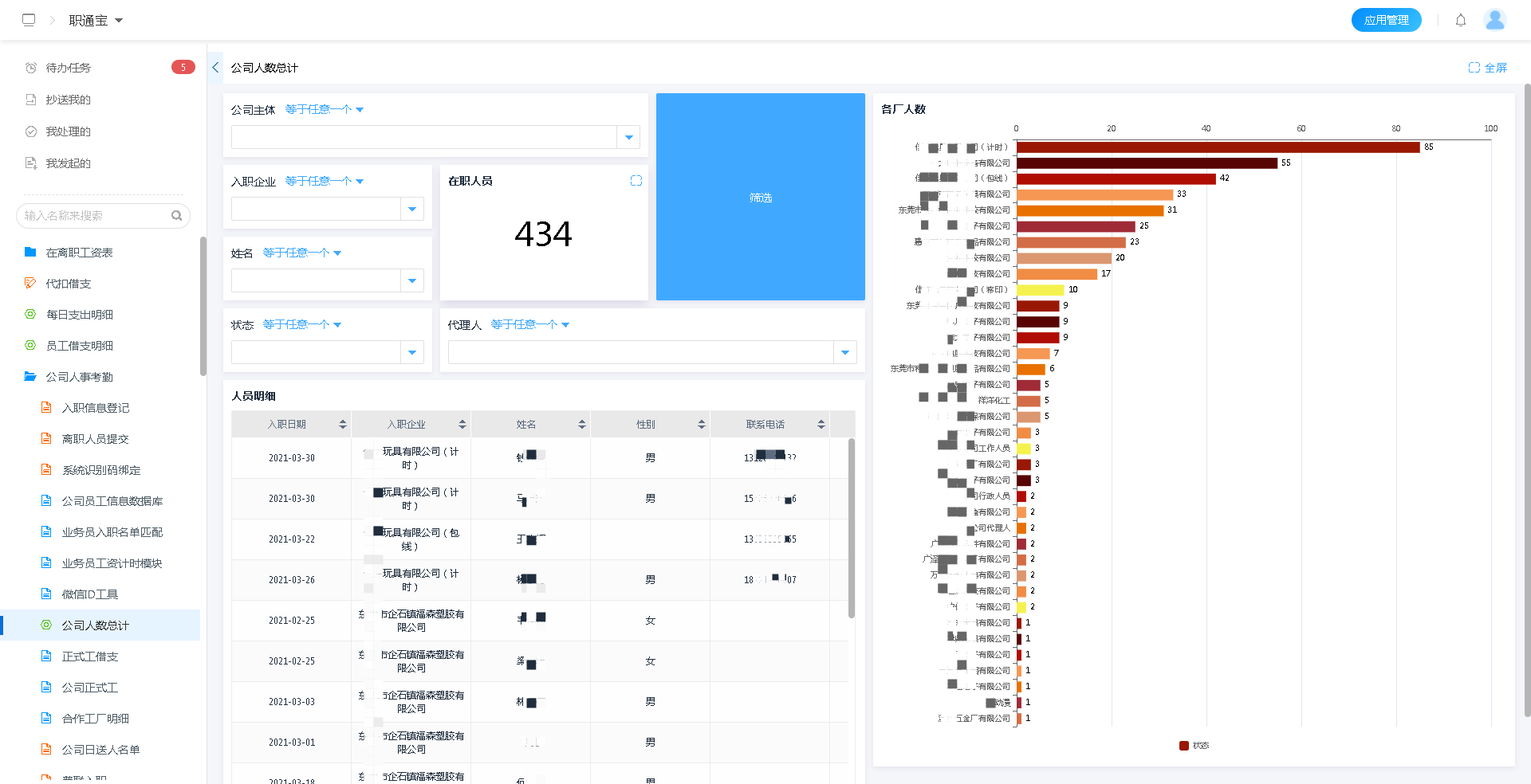 3、利用云境Support的报表体系,实时统计所辖企业的在职人员、离职人员、人员入职渠道以及各种与人事相关费用的申报、使用、管理情况。所有款项收支,无论是明细还是汇总分析,借助多样化报表展示一目了然。