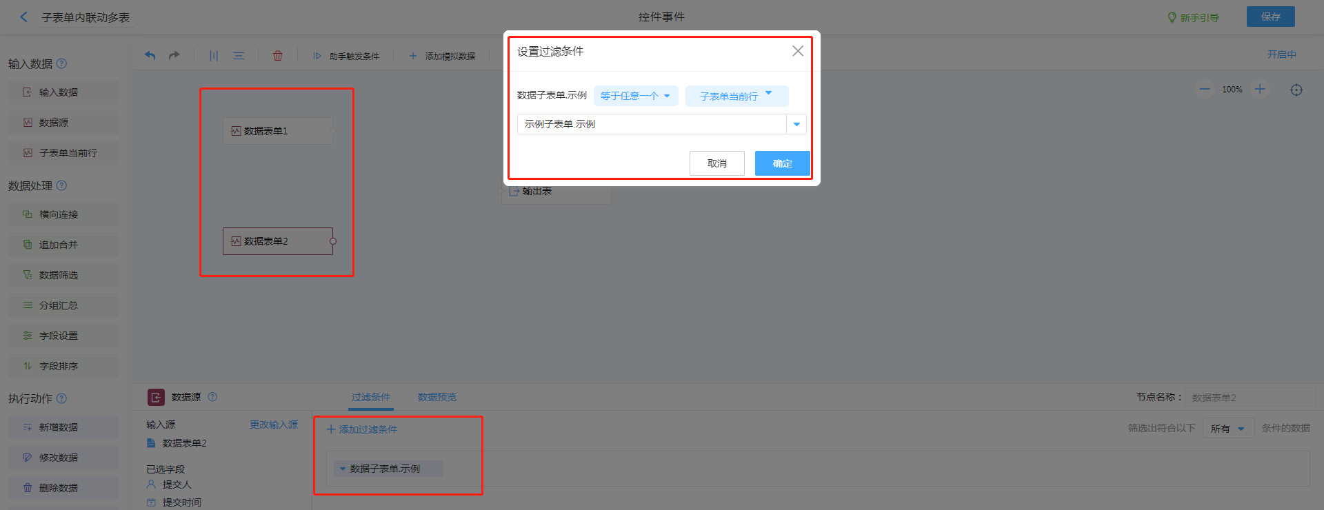 通过对控件进行数据助手配置,实现联动多个子表单进行数据调取。