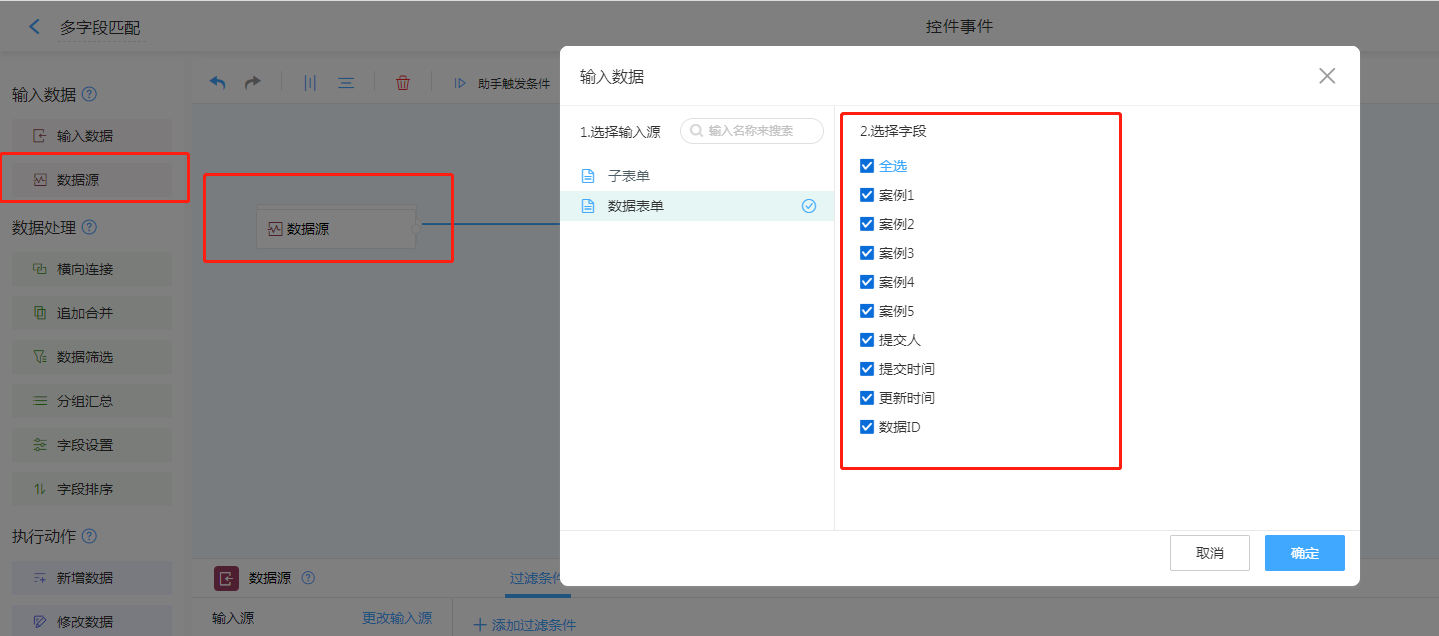 通过对控件进行数据助手配置,实现根据控件输入值对目标表进行多字段匹配,并将符合匹配条件的目标表数据联动显示在当前表。