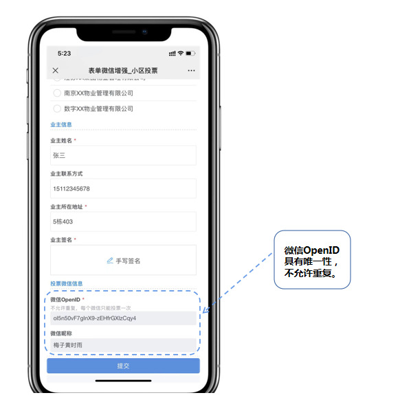 需要填写者点击同意授权后方可填报数据,可获取微信OpenID、微信UnionID、微信头像、微信昵称、微信性别。我们在小区投票的应用中选择的是弹窗获取,需要业主同意授权方可获取信息。