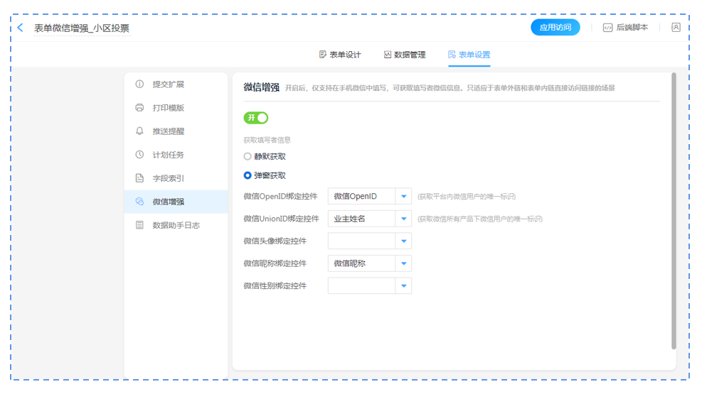 小区业主表决投票实行一人一票制,在完成投票表单内容的基本搭建后,在后台找到表单设置,选择微信增强,即可开启模式。