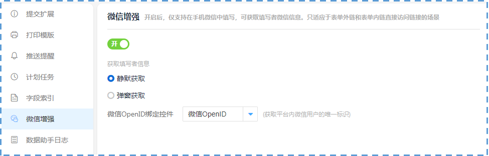 微信增强支持2种方式获取填写者信息分别为静默授权和弹窗获取。