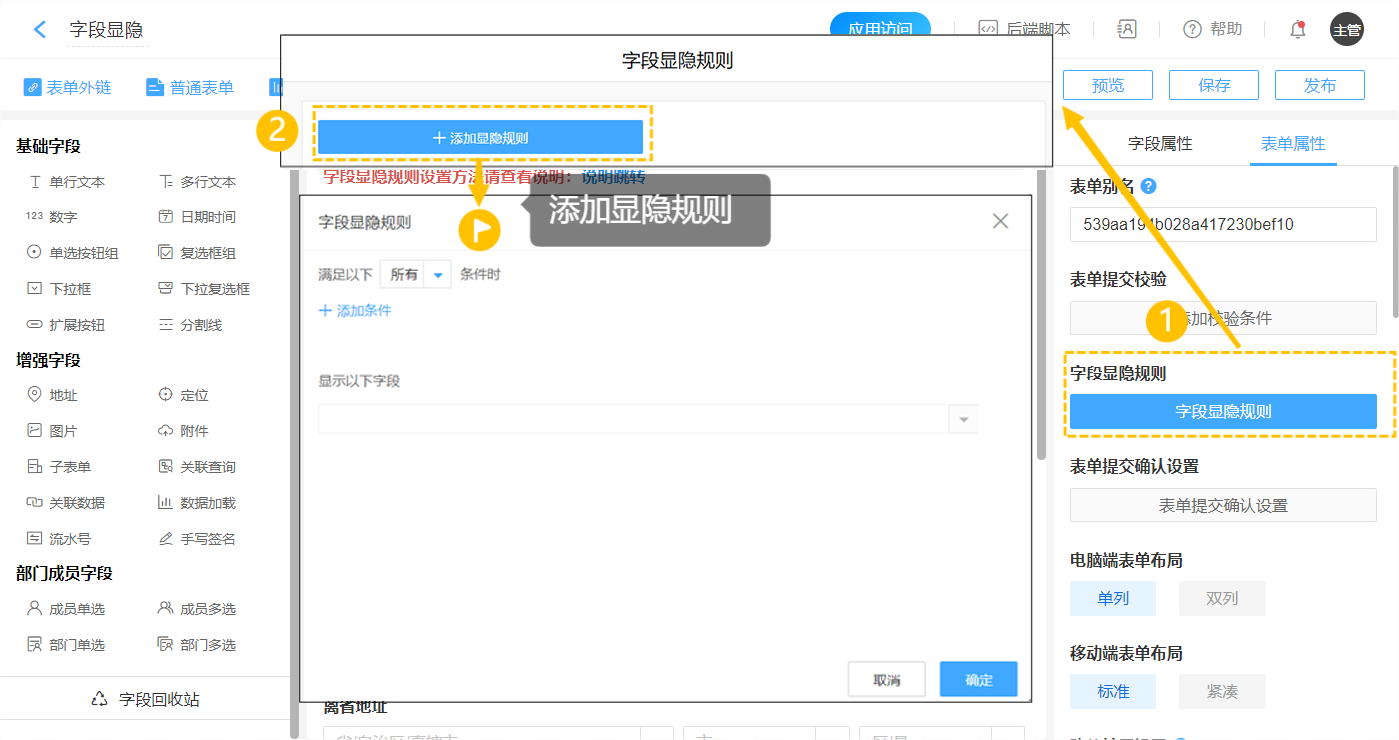 则可在【表单设计】—【表单属性】选择【字段显隐规则】: