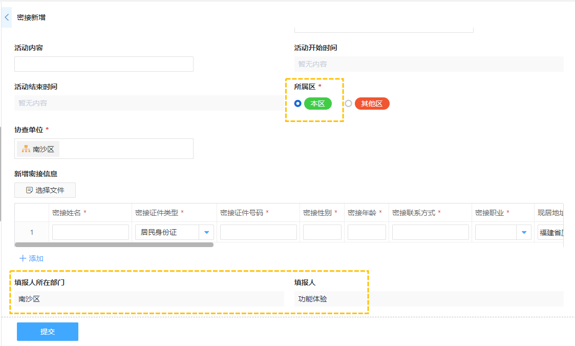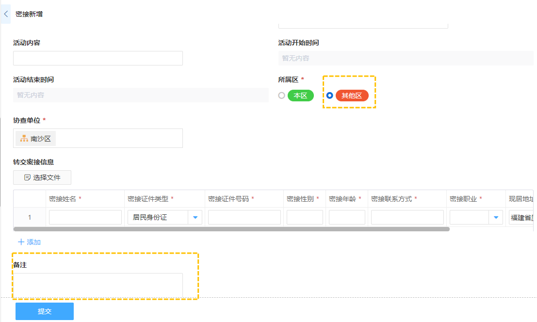 · 如新冠疫情流调系统->密接新增中,设置所属区在本区条件下显示填报人及所在部门填写信息,而在其他区条件下显示可填写备注信息。