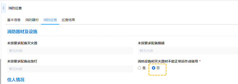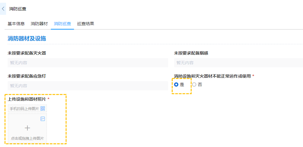 · 如消防巡查系统->消防巡查中,设置消防设施和灭火器材不能正常运作或使用为是的条件下显示上传设施和器材照片信息,而在否条件下隐藏。
