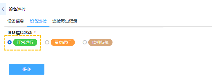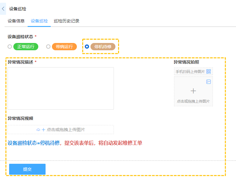 · 如设备巡检管理系统->设备巡检中,设置设备巡检状态为停机待修的条件下显示异常情况信息,而在正常运行条件下隐藏。