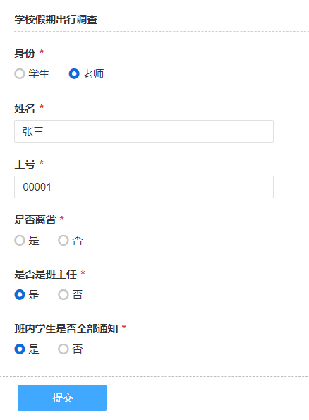我们以学校放假安排调查场景为例,如学生需填写:「姓名」、「学号」、「是否离省」等字段;而老师除了填写:「姓名」、「工号」、「是否离省」外,还需要填写「是否是班主任」等字段。我们便可以通过字段显隐规则,设置在老师身份下显示「是否是班主任」等字段,而学生身份下隐藏。