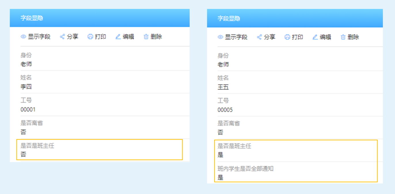 设置【字段显隐规则】后,当「身份」 等于「老师」时自动显示「是否是班主任」,且当「是否是班主任」 等于任意一个「是」时即自动显示「班内学生是否全部通知」字段。
