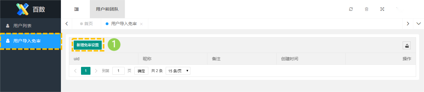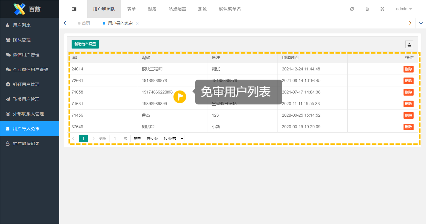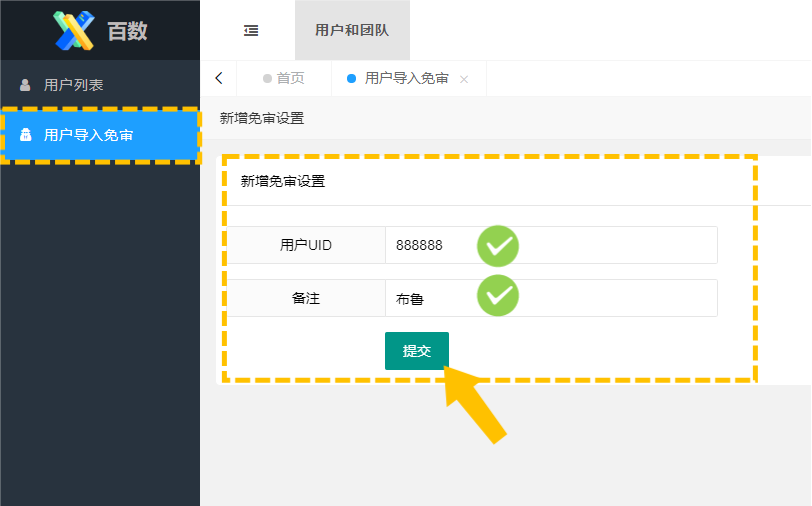 进入用户导入免审>新增免审设置后,输入免审的指定团队成员的UID及名称备注提交,即完成该账号免审设置。