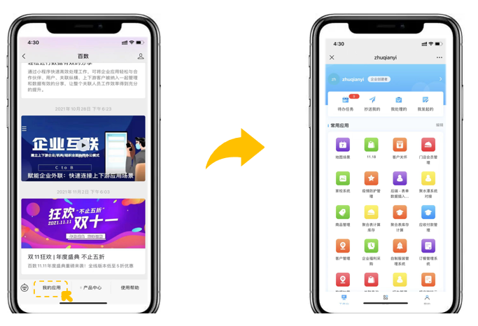 以云境Support公众号为例,配置完成后,我们可以在移动端实现丰富的办公体验。在公众号的菜单栏点击我的应用即可进入到移动端工作台。