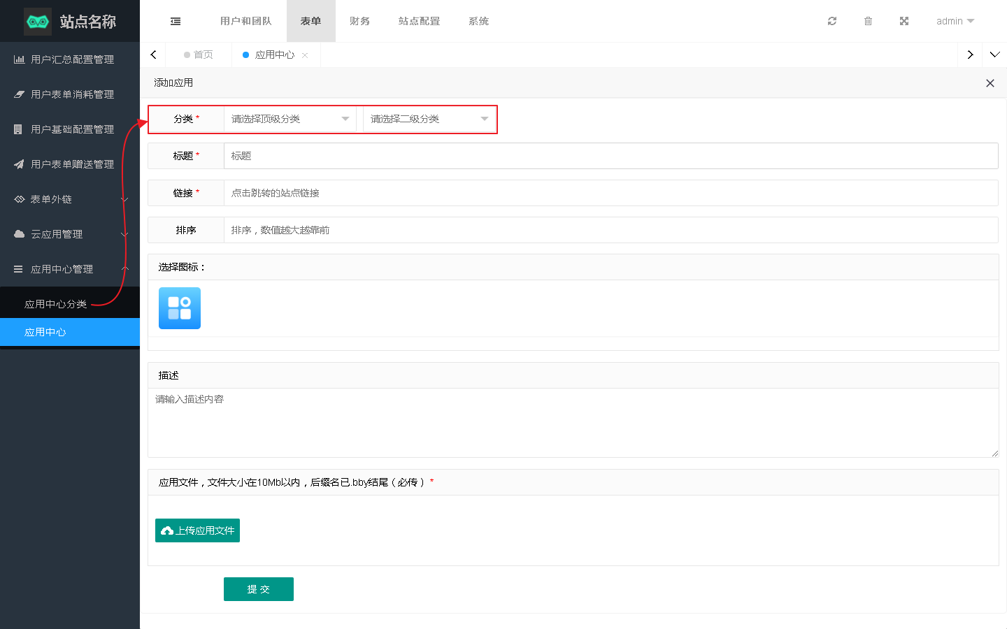 通过设置分类、标题、链接,选择应用图标,并上传应用安装包到工作台完成应用添加。
