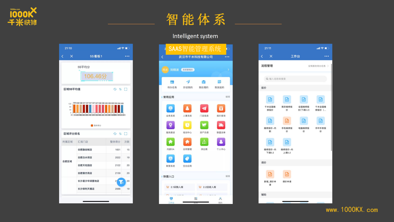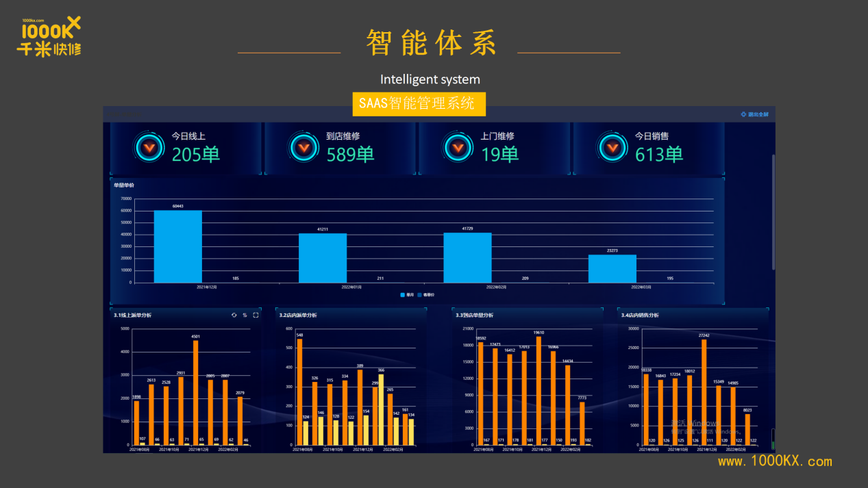 千米快修选择云境Support搭建SaaS智能管理系统,从人、钱、事、物四个维度进行应用开发配置,实现包括门店员、财务、销售、库存等多板块智能管控。