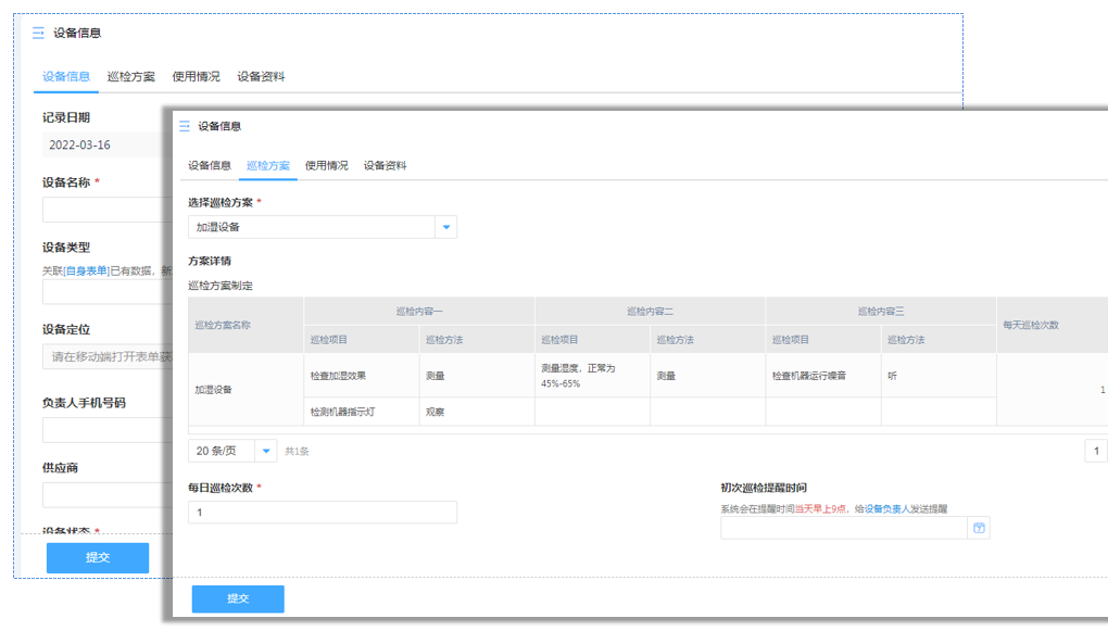 借助云境Support子表单功能可以同时录入或调阅与设备信息相关的多个表单内容,例如切换巡检方案表单可以确认巡检指标,减少检查纰漏。