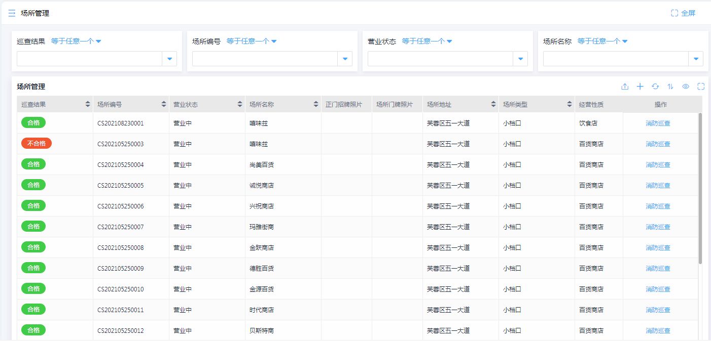 场所巡检结果通过报表的形式进行汇总后,可借助自定义字段进行筛选查询,例如可以快捷地筛选巡查结果为“不合格”的场所进行统一整顿,提高办事人员的效率。