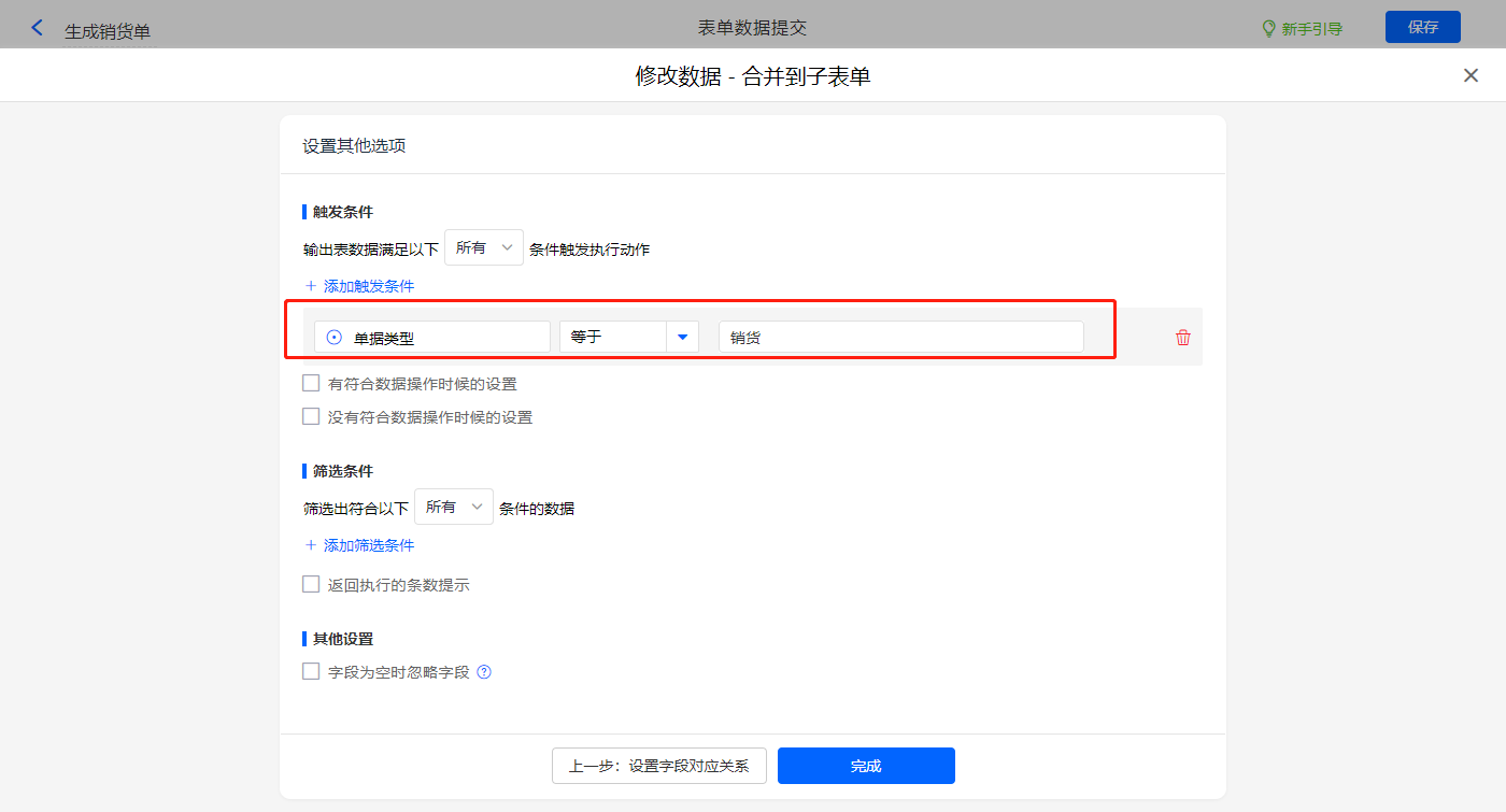 其他设置触发条件为【单据类型】字段等于销货,设置好点击【完成】并保存该数据助手;
