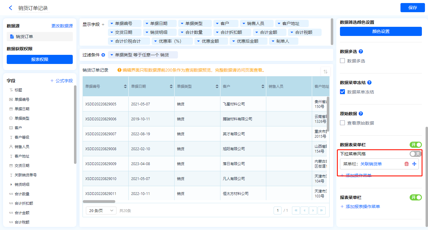 【关联销货单】的菜单栏,操作模式设置为弹出报表【历史销货单】;