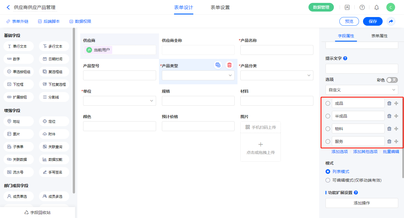2.6、表单【供应商供应产品管理】字段及表单属性设置