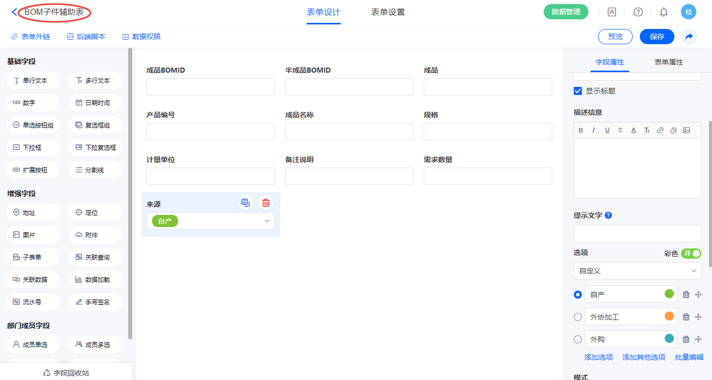 2.4、表单【产品结构清单(BOM)】字段及表单属性设置