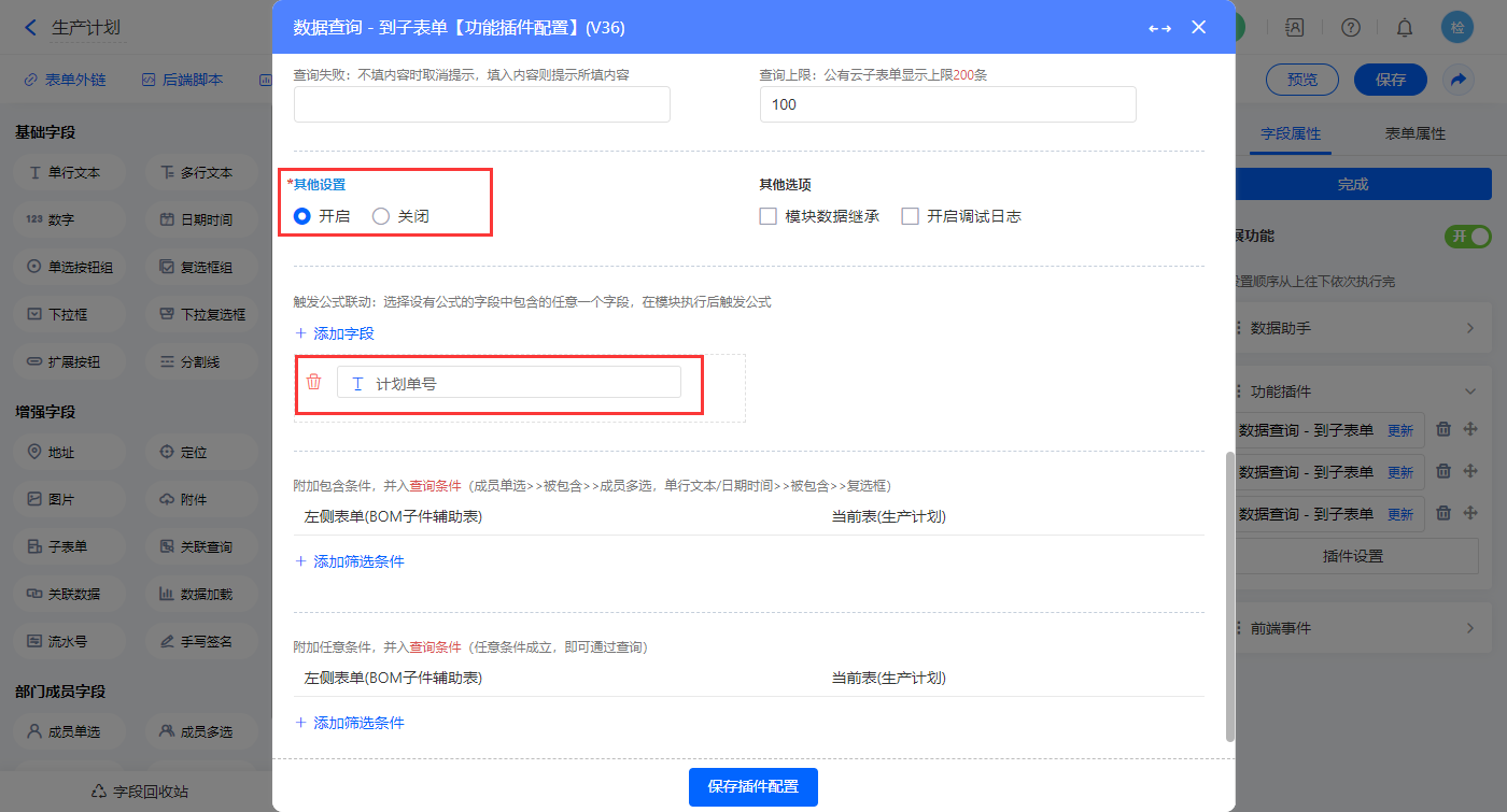 设置三个【数据查询 - 到子表单】功能插件,如图配置;第一个配置【子生产计划明细】子表单;