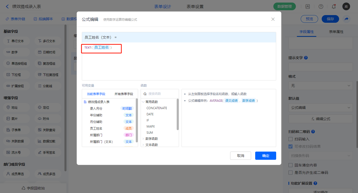 【员工姓名(文本)】字段,默认值选择公式编辑,如图设置公式;