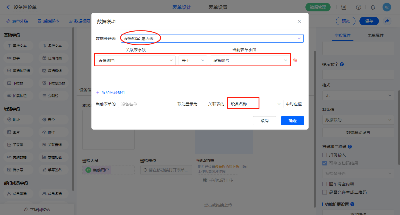 【巡检信息.设备名称】字段,设置默认值为数据联动,设置联动条件及联动字段;