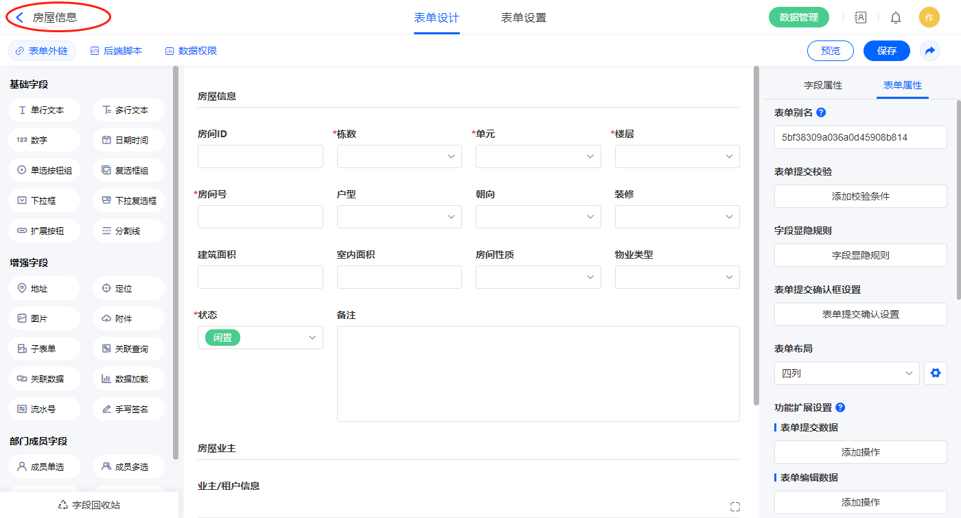 | 业主/租户 | 成员单选 | 房屋ID | 单行文本 |