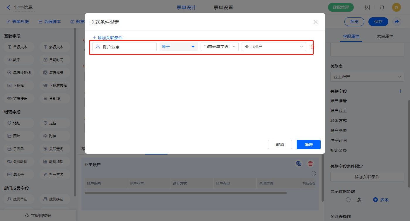2)【业主/租户信息】关联查询字段,设置关联表为【业主信息】并如图选择关联字段,设置显示数据条数为多条;