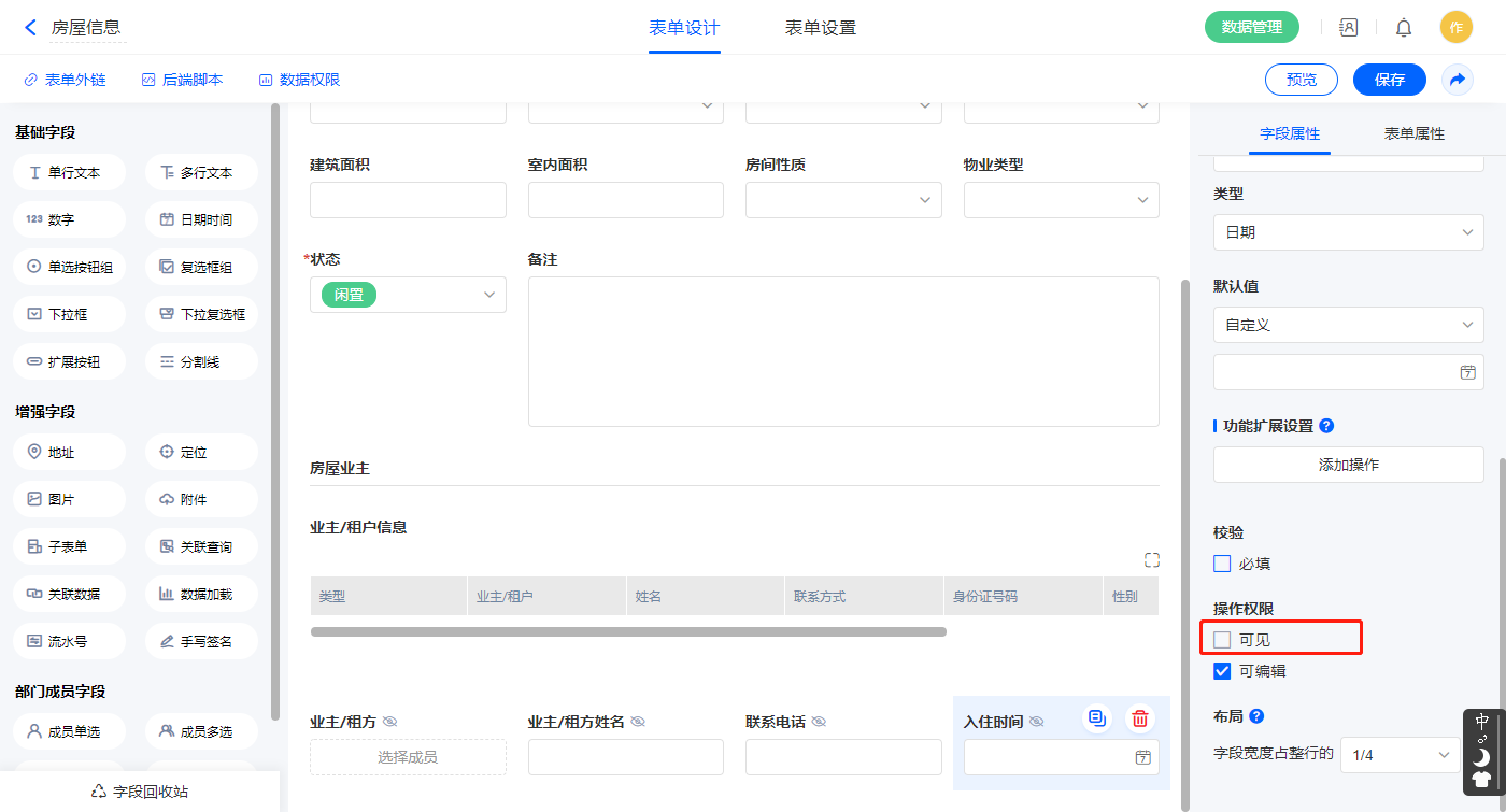 1)选中【业主/租方】、【业主/租方姓名】、【联系电话】、【入住时间】字段,设置不可见;