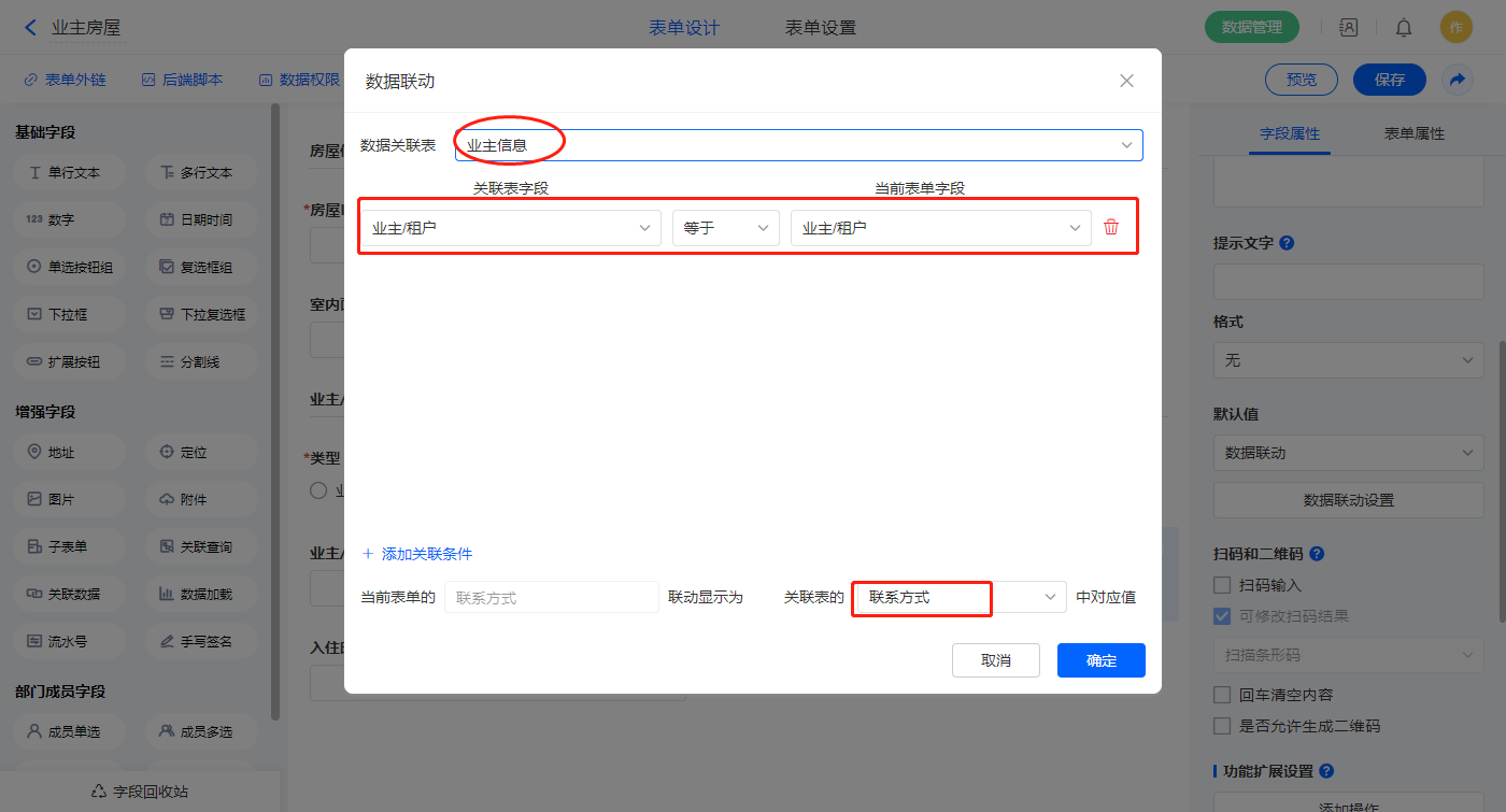 2)【联系方式】字段,设置默认值为数据联动,设置联动条件及联动字段;