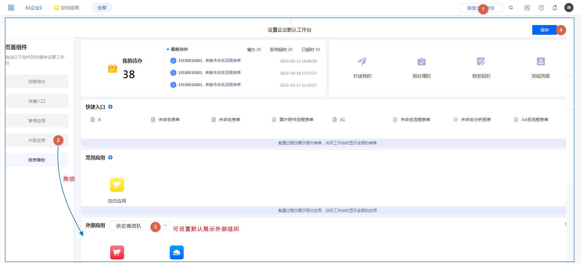 工作台 >> 自定义工作台 >> 设置企业默认工作台/设置我的工作台 >> 添加外部应用板块 >> 保存