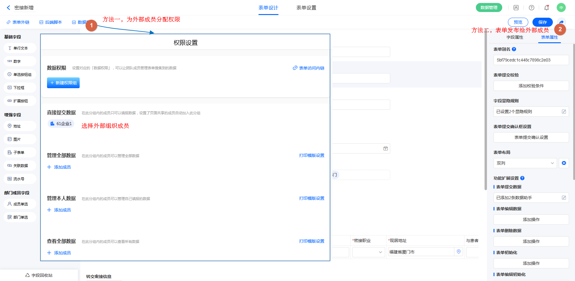 进入表单设计页面 >> 数据权限,在权限组下设置互联组织的成员或部门。