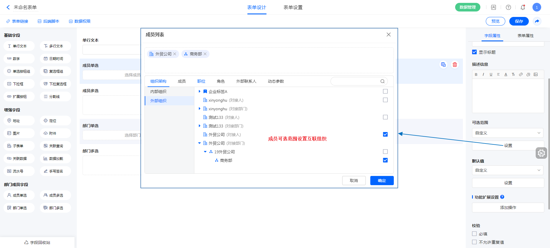 在成员字段设置时,同样可以设置「可选范围」和「默认值」为互联组织中的成员。如下图为可选范围的设置: