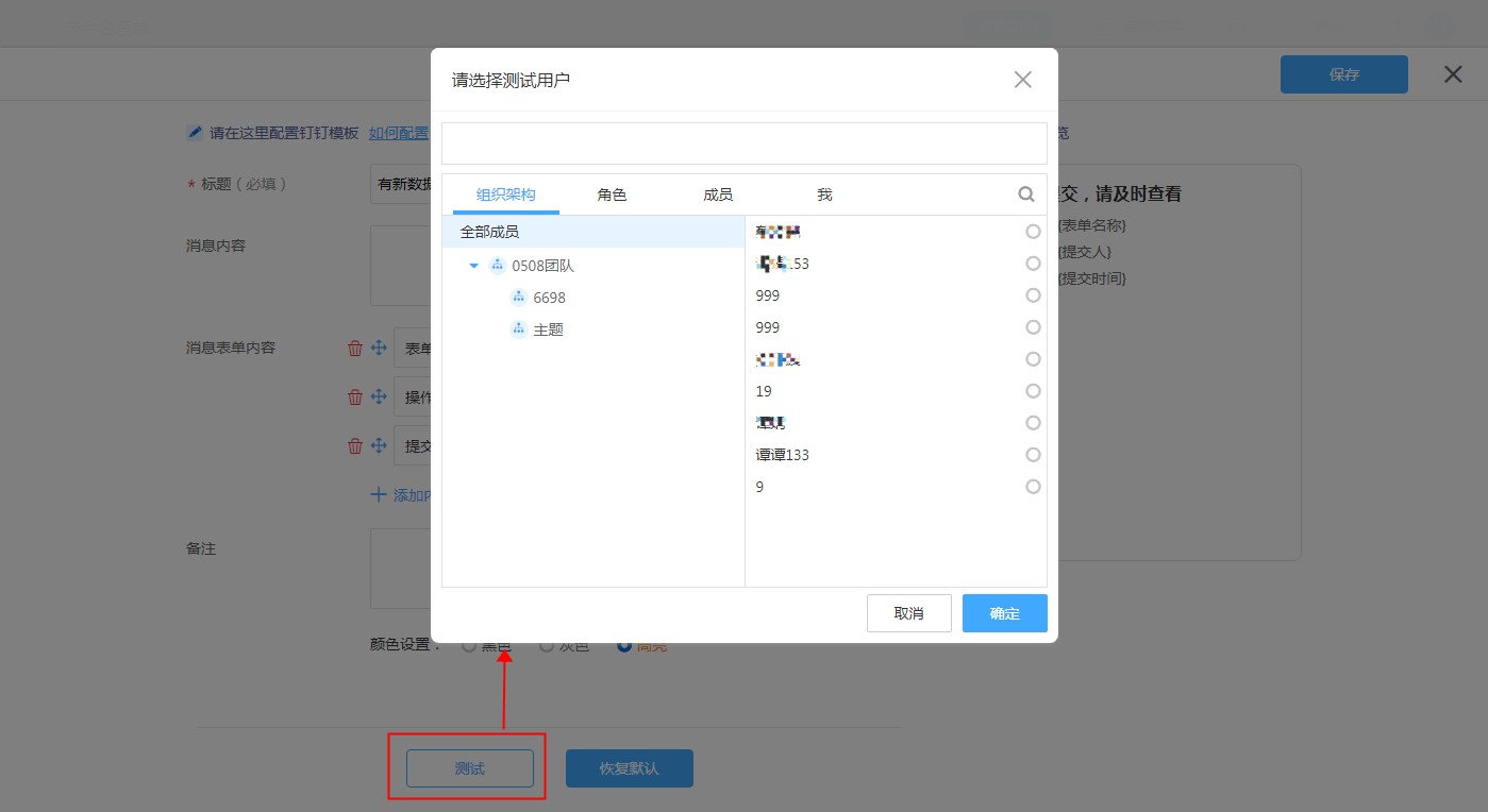 点击测试,选择收件人,确认即可将当前消息模板内容发送给此收件人。