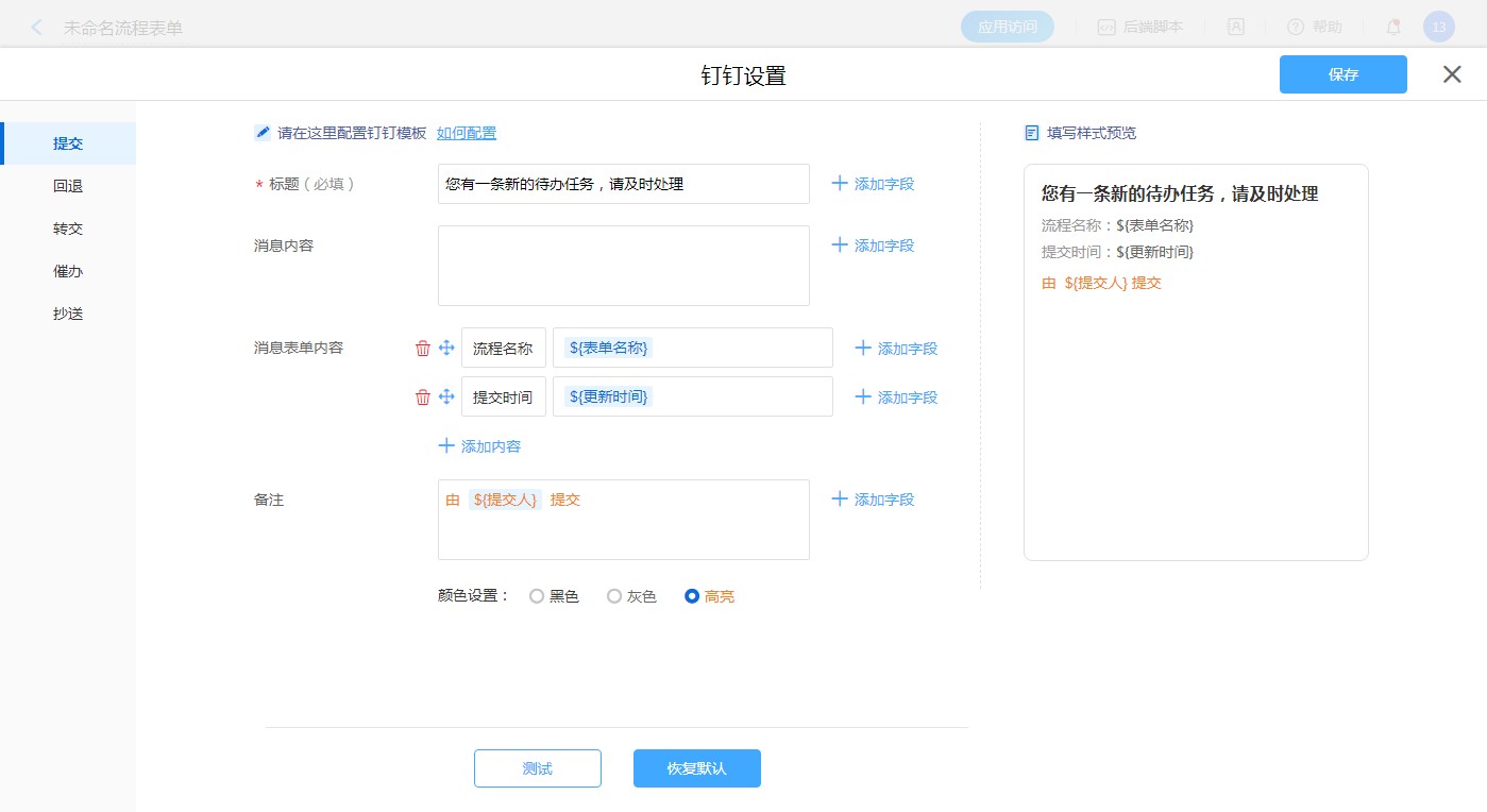 【普通表单设计】-【表单设置】-【消息推送】-【新建消息推送】-【钉钉提醒,钉钉设置】