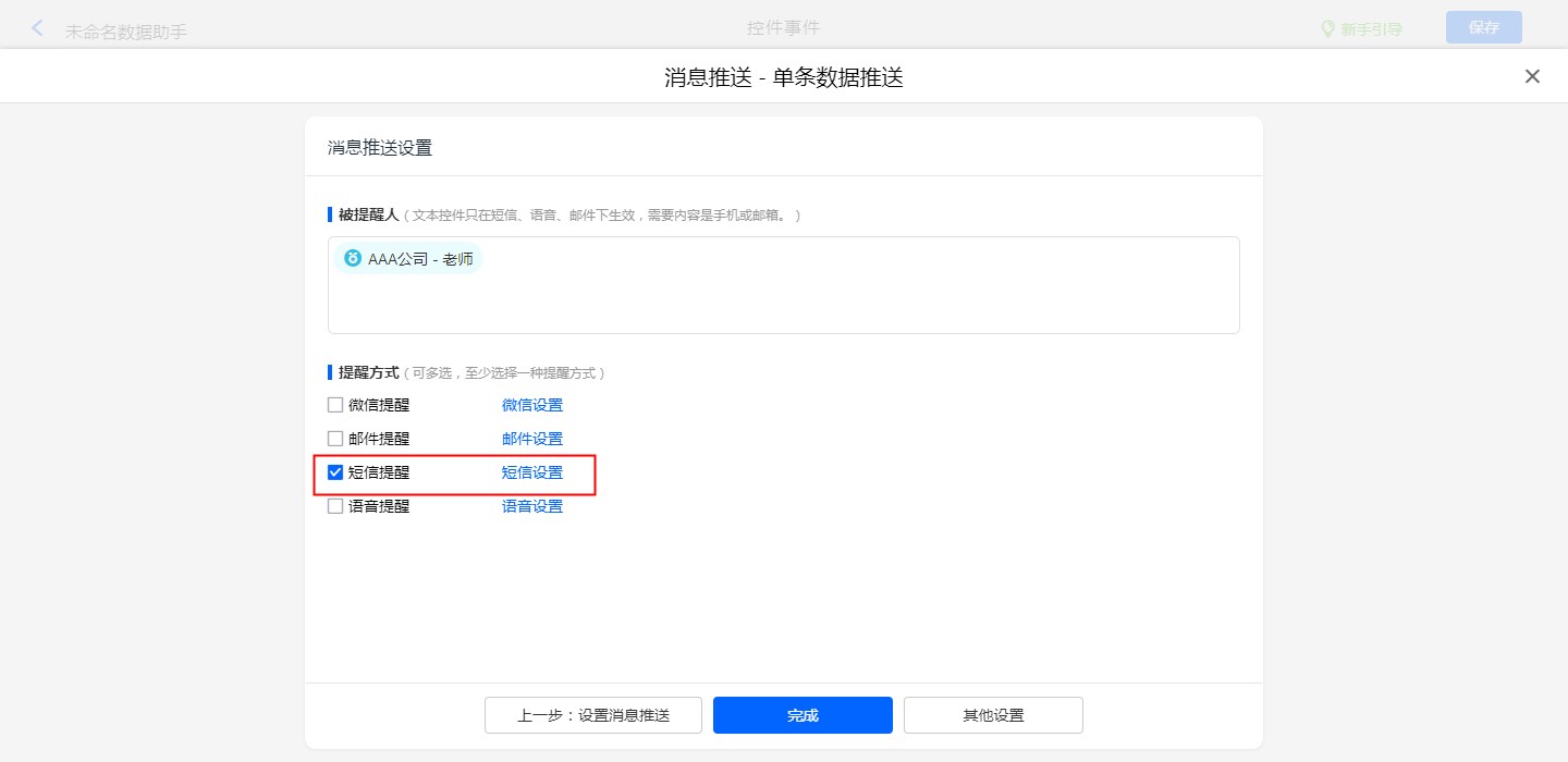 【普通表单设计】-【表单设置】-【消息推送】-【新建消息推送】-【短信提醒,短信设置】