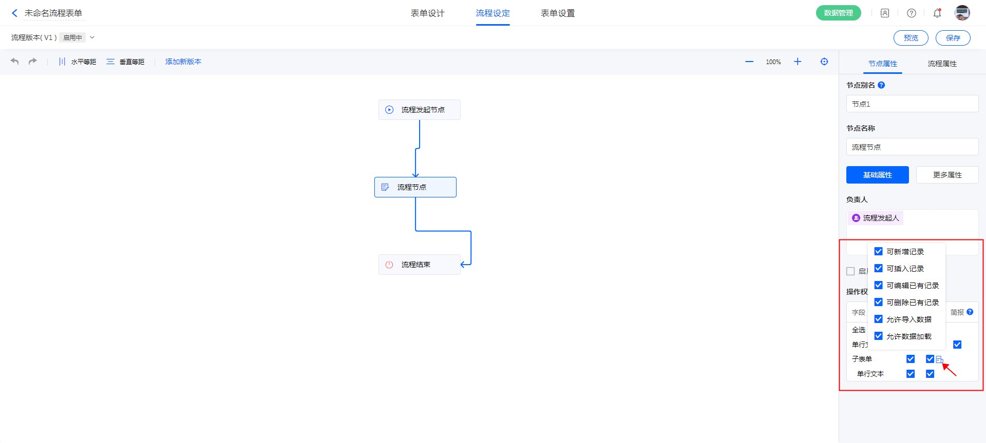 2)新建子表单时,默认勾选全部操作权限,如部分权限不需要,可以手动去除。