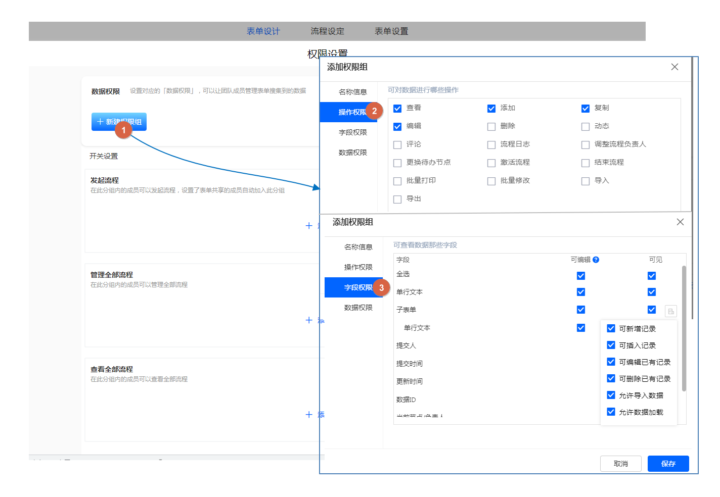 点击子表单「字段权限」旁的标识设置子表单「操作权限」。这是流程流转过程中的操作权限设置,如需流转后编辑数据对子表单进行相应操作,需要在【权限组】中自定义设置操作权限。