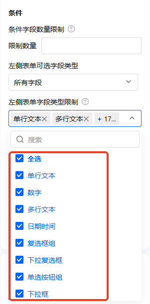 可选字段类型是限制当前表单的字段类型,可选字段类型目前支持:普通字段、子表单字段以及所有字段(子表单字段和普通字段)。