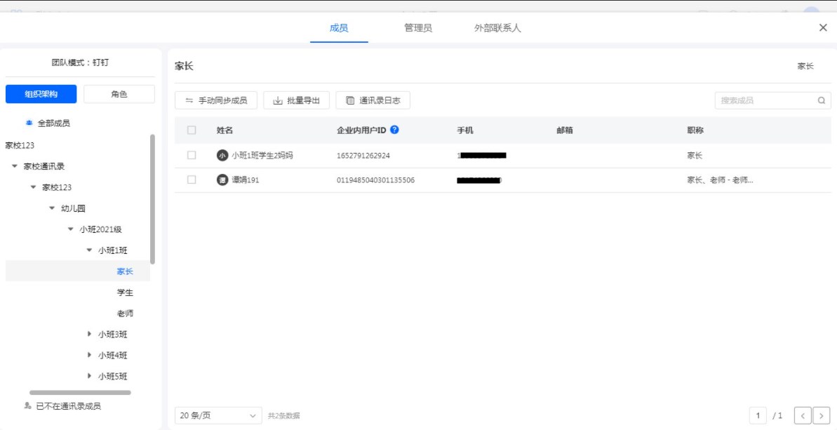 钉钉家校通讯录的成员同步到系统通讯录中,会根据身份自动加入家长、学生、老师部门,且拥有对应的家长/学生/老师职称。