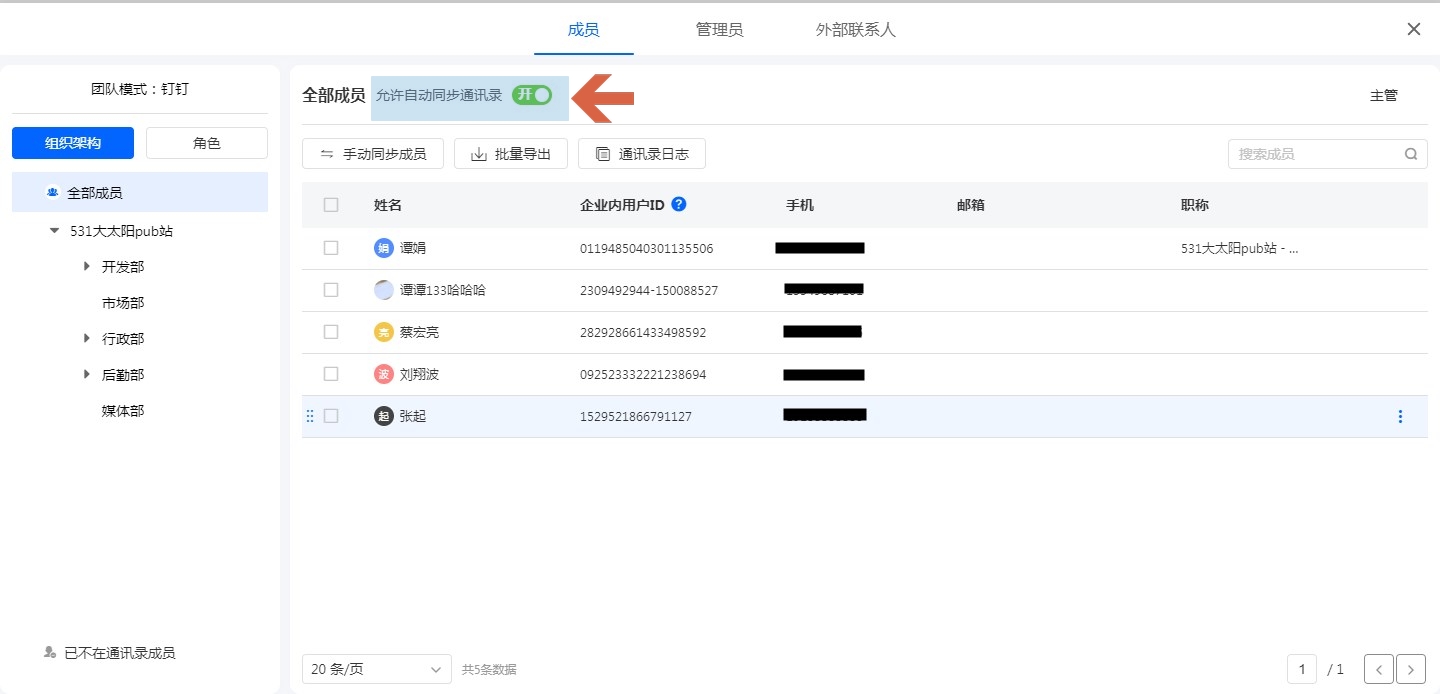 关闭自动同步功能后,可在钉钉通讯录中修改成员信息后,点击手动同步成员按钮进行组织架构的同步操作。
