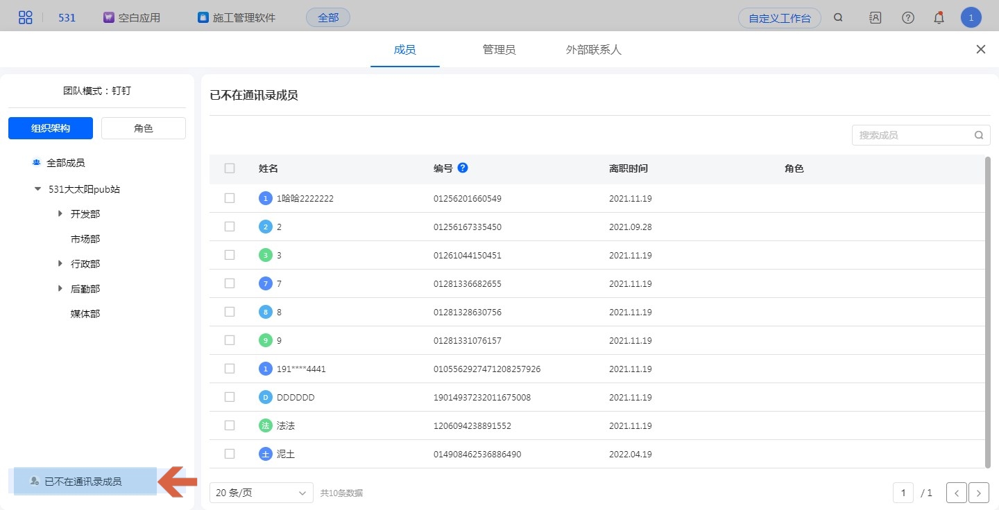 企业成员离职后,在钉钉通讯录操作成员离职。自动同步或者手动同步后,即可在「离职成员」界面看到已经离职的成员信息及其负责的工作并进行交接。
